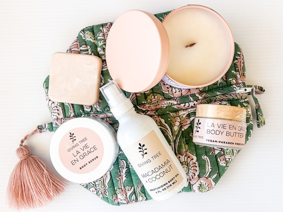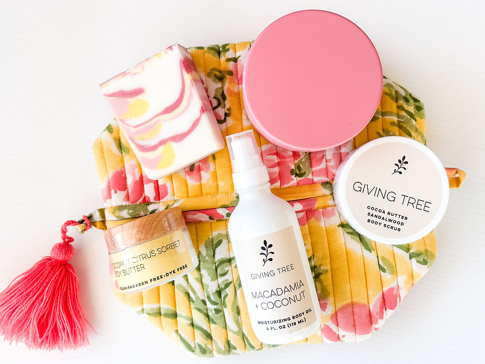 Includes seasonal soap bar, 4 oz bottle of moisturizing body oil, a mini body butter, mini body scrub, 5 oz seasonal candle with wood wick, and a gorgeous hand block printed, quilted bag.